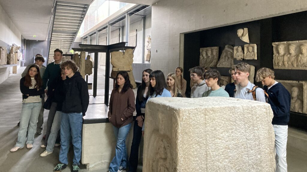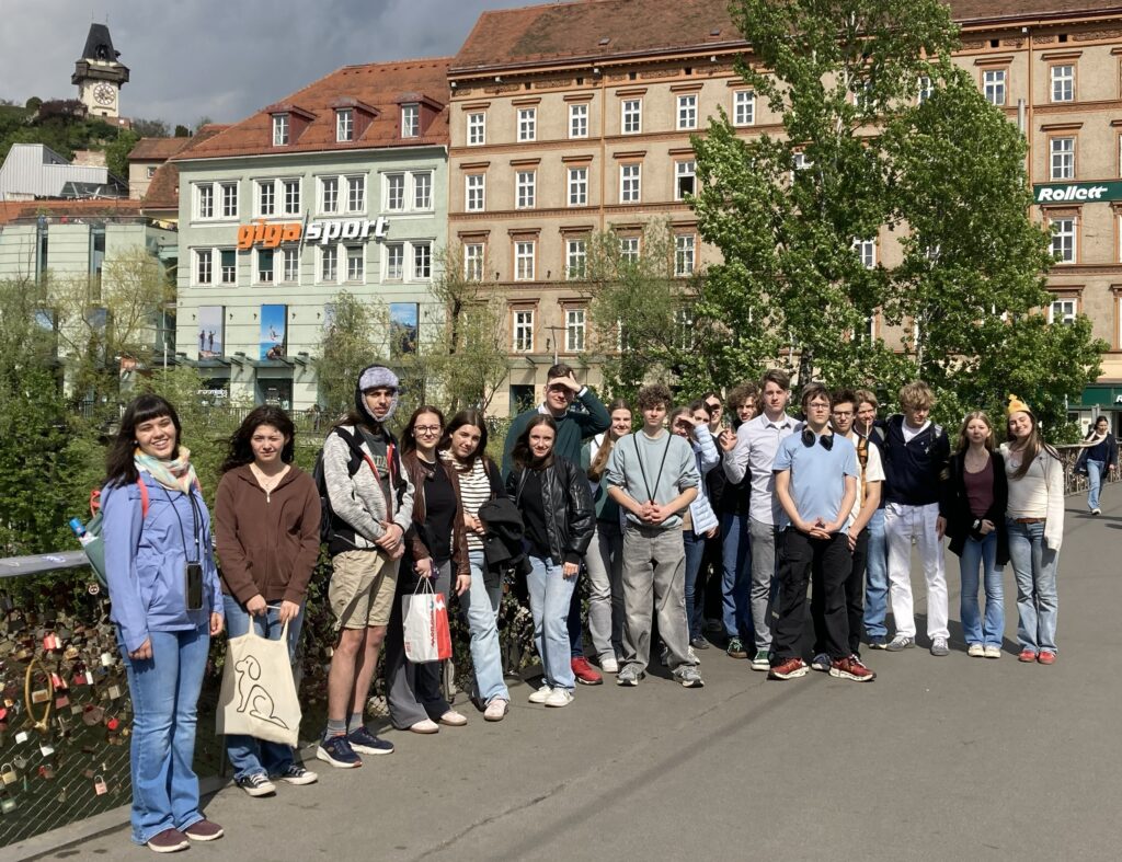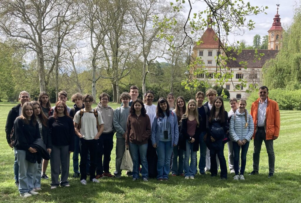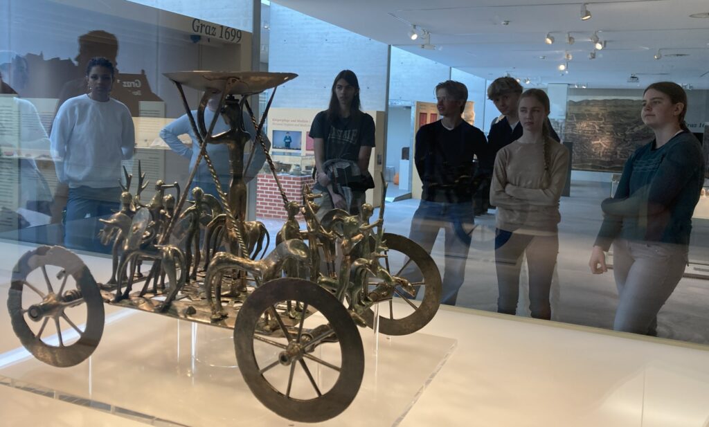 Montag, 20. April 2026: Pünktlich um 08:38 Uhr fährt der Railjet nach 42 Minuten Fahrtzeit am Hauptbahnhof Graz auf Gleis 5 ein. Die Lateingruppen 6a7a erkunden heute bei Sonnenschein in Begleitung von Prof. Schöffmann und Dir. Triebnig den Stadtbezirk Eggenberg mit dem gleichnamigen Barockschloss, den Park mit mehreren stolzen Pfauen und das neben dem Planetengarten gelegene Archäologische Museum. Unter der fachkundigen, engagierten und wortreichen Führung von Frau Dr. Barbara Porod werden unseren Schülerinnen und Schülern mehrere Highlights des Museums präsentiert: Die Römersteinsammlung mit kunstvoll bearbeiteten Porträts und figürlichen Darstellungen von Menschen, die vor ca. 1800 Jahren in dieser Region gelebt und gearbeitet haben. Verschiedene Gesellschaftschichten und Berufe sind auf diesen Zeugnissen aus Marmor zu erkennen, auch das eine oder andere Lateinvokabel ist auf den Originalinschriften bereits bekannt. Der berühmte Kultwagen aus Strettweg aus dem 7. Jh. v. Chr., Helme und Panzer, eindrucksvolle, große Bronzegefäße aus keltischer Zeit, Erklärungen zur Arbeitsweise der Archäologie sowie ein virtueller Stadtrundgang in Graz des ausgehenden 17. Jh. runden den Vormittag ab.