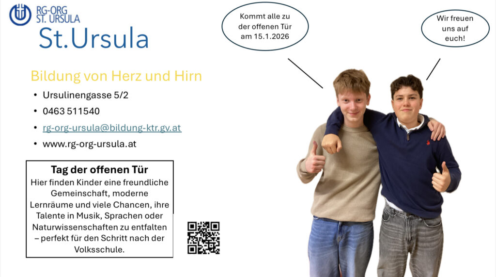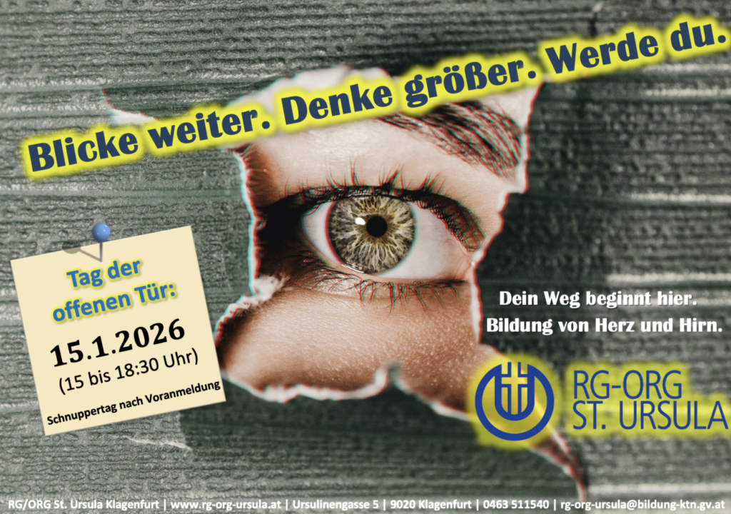 Im Unterrichtsfach „Digitale Grundbildung“ entstanden kreative Beiträge zur schulischen PR-Arbeit, die im Zuge der Auseinandersetzung mit Medienkompetenz und Mediengestaltung entwickelt wurden. Die Ergebnisse zeigen vielfältige gestalterische Ansätze und spiegeln sowohl technisches Können als auch Engagement, Teamarbeit und einen reflektierten Umgang mit digitalen Medien wider. Die entstandenen Designs präsentieren die Schule in einem einladenden Erscheinungsbild und tragen zur Vorbereitung des Tags der offenen Tür am 15. Januar 2026 von 15:00 bis 18:30 Uhr bei.